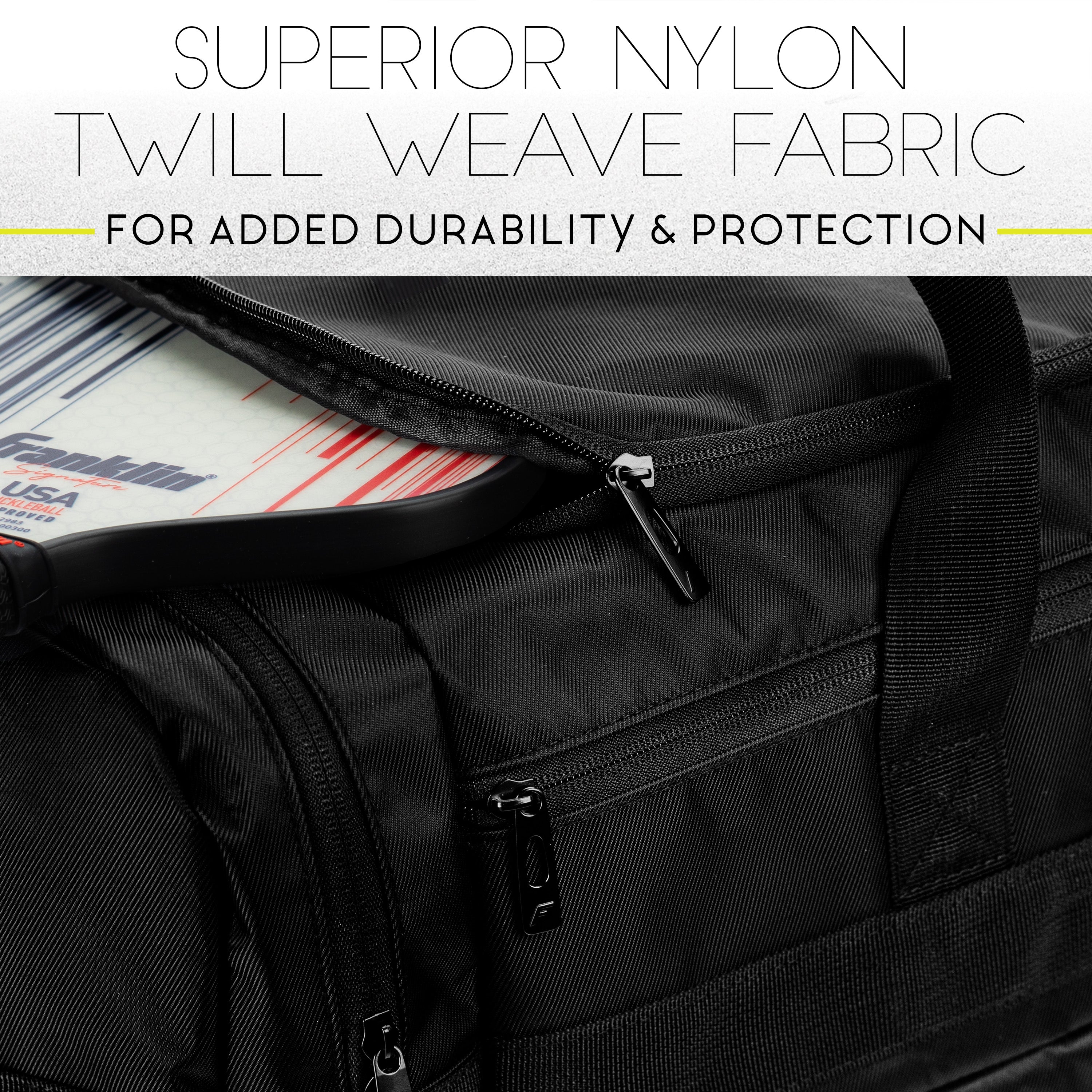 The Franklin Pickleball Elite Duffel Bag is the ultimate gear carrier for pickleball players who demand style, durability, and functionality. Made with high-end nylon twill weave fabric and reinforced zippers, this bag is designed to withstand the rigors of regular use while keeping your equipment organized and protected. Perfect for players of all levels, this bag offers ample space for paddles, shoes, and all your pickleball essentials.