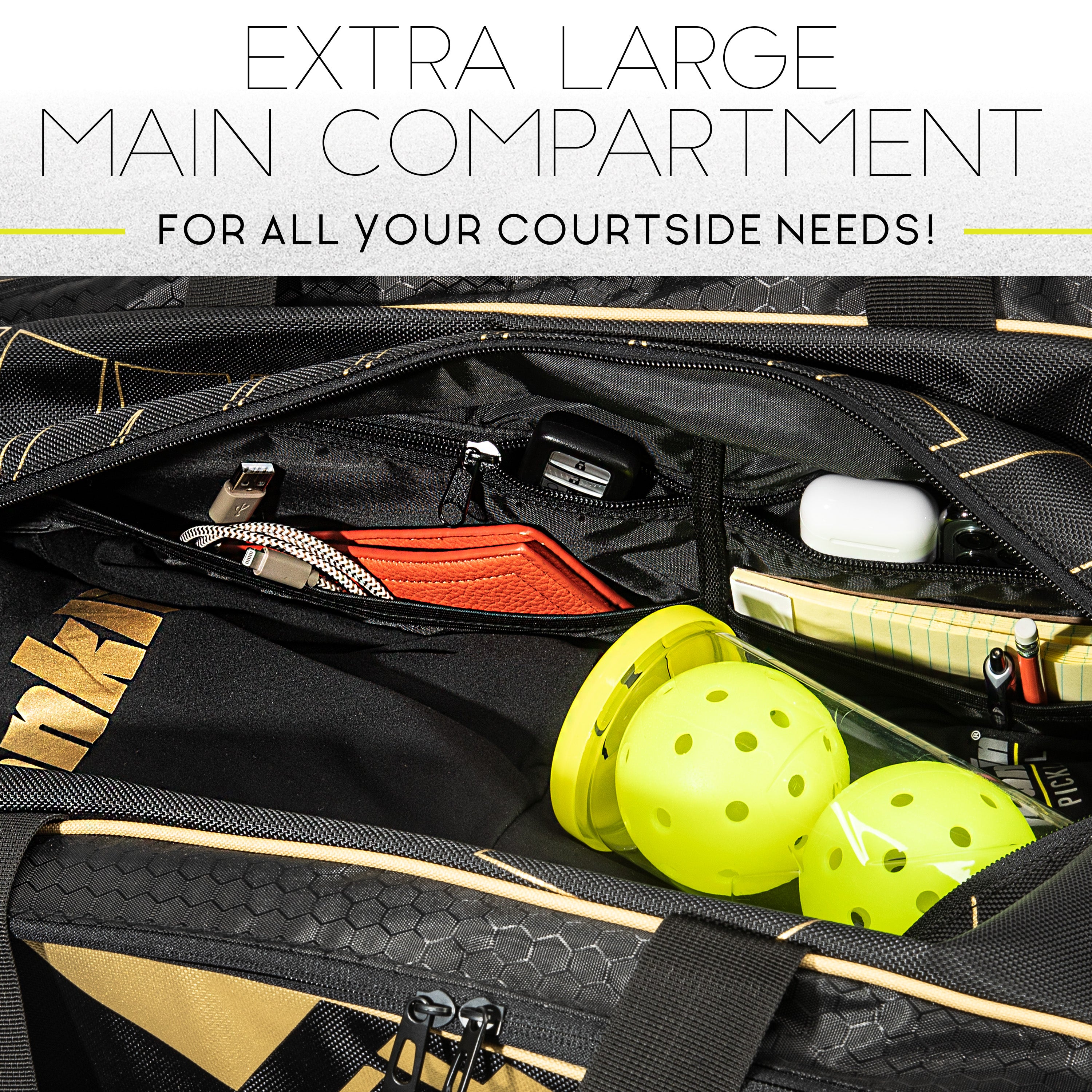 The Franklin Pickleball Pro Series Paddle Bag- Gold/Black offers a premium solution for organizing and transporting your pickleball essentials. Designed with input from professional players, this bag ensures a seamless blend of style, functionality, and versatility for players of all levels.