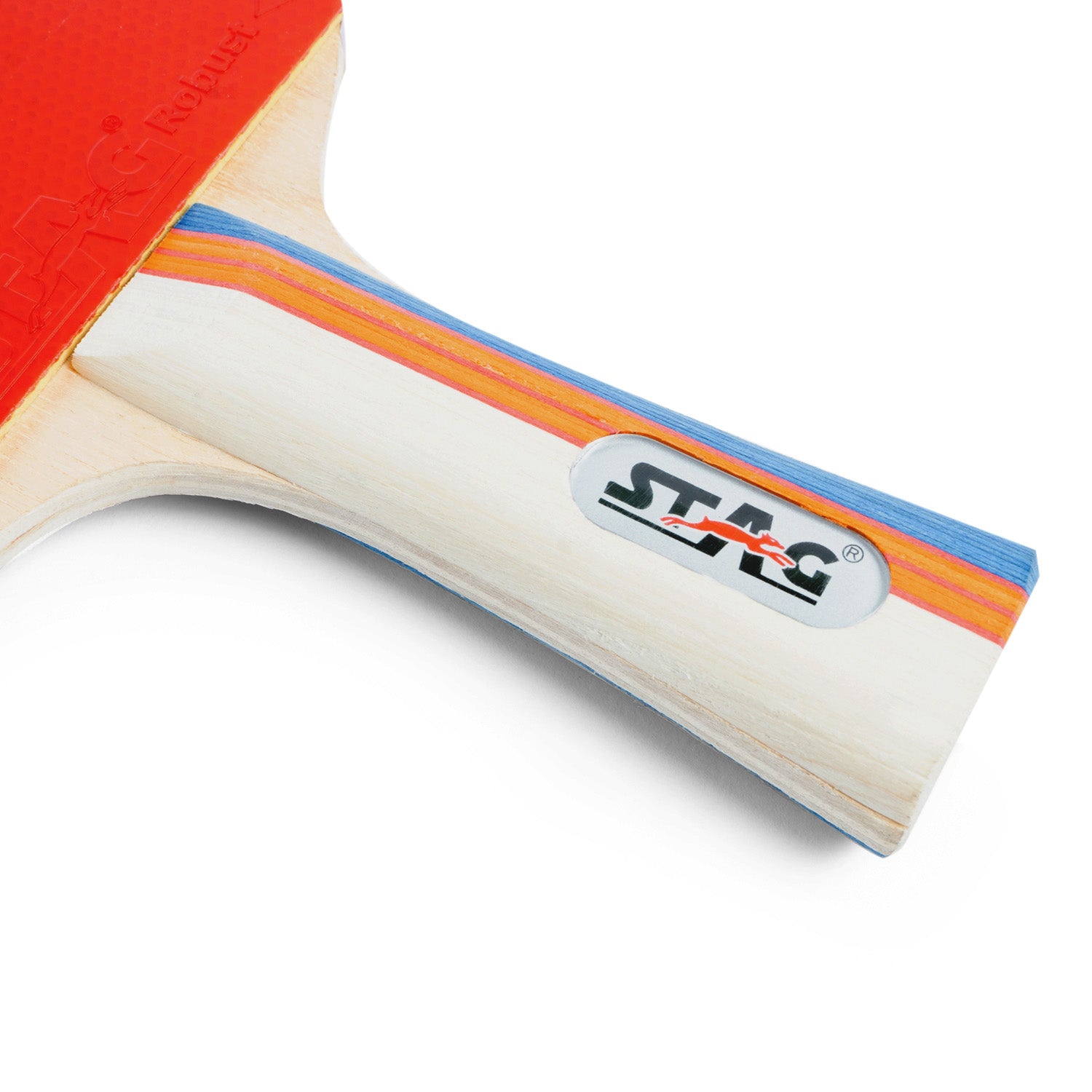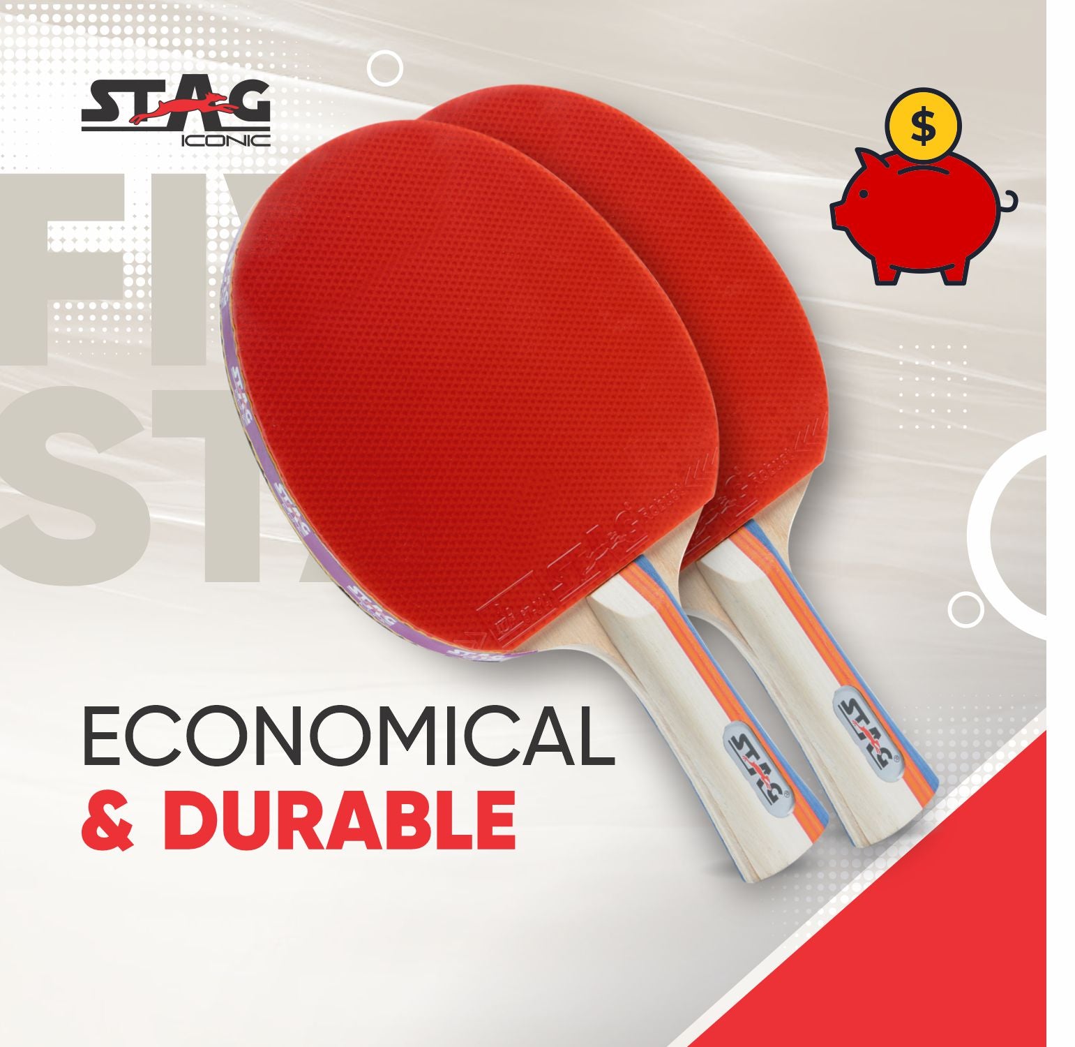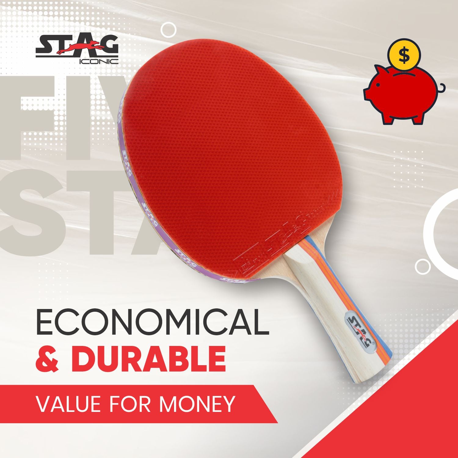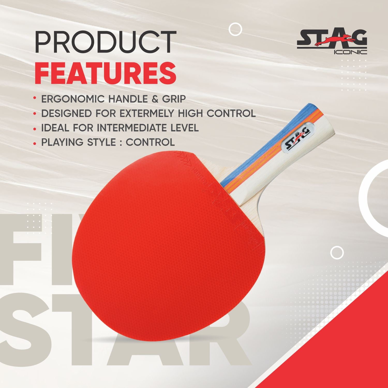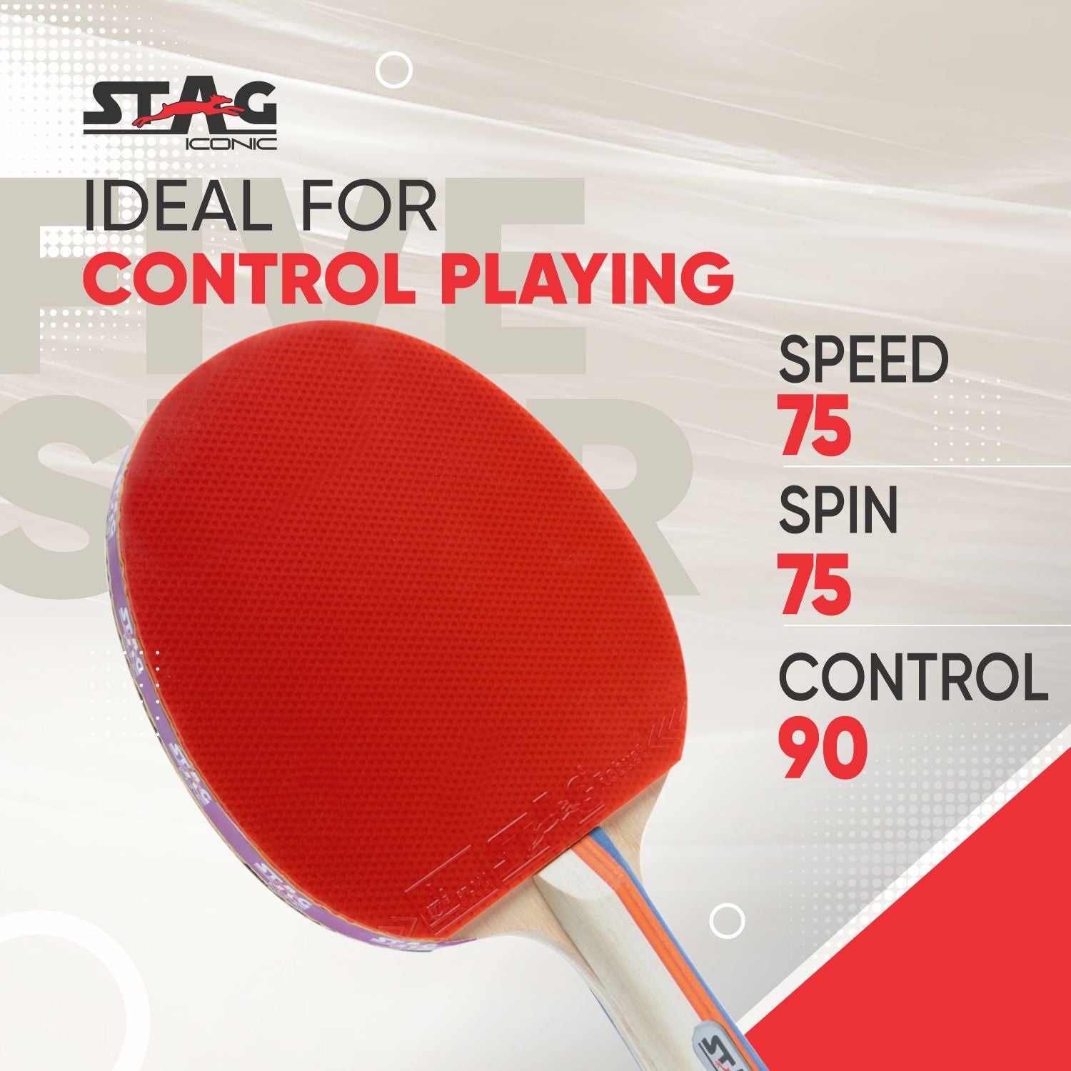 The Stag Iconic 5 Star Table Tennis Racquet is designed for beginner to intermediate players looking to improve their game with precision, power, and control. Featuring ITTF-approved premium rubber and a custom-designed comfortable grip, this racquet offers a professional-level playing experience. The flared handle provides a secure grip, while the stiff wooden blade ensures powerful, consistent shots. With balanced ratings of speed, spin, and control, the Stag Iconic 5 Star is the ideal choice for players seeking reliable performance.