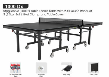 - Packaging Includes: 1 Stag Iconic 1000 DX Table Tennis Table with 1 Clamp Net Set, 1 Table Cover, 2 Rackets, and 3 Balls.
