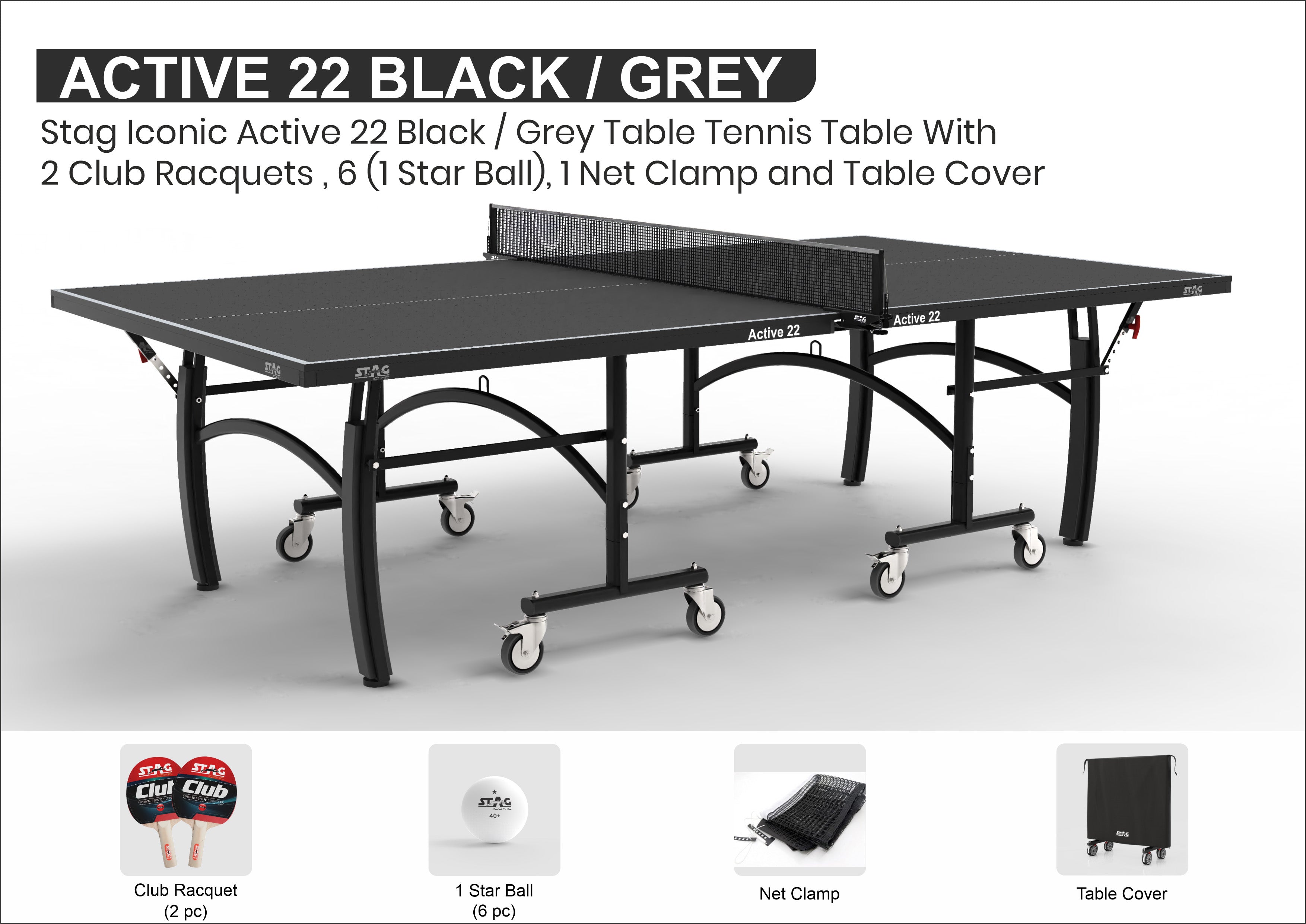 - Packaging Includes: 1 Stag Iconic Active 22 Black/Grey Table Tennis Table with 1 Clamp Net Set, 1 Table Cover, 2 Rackets and 3 Balls.