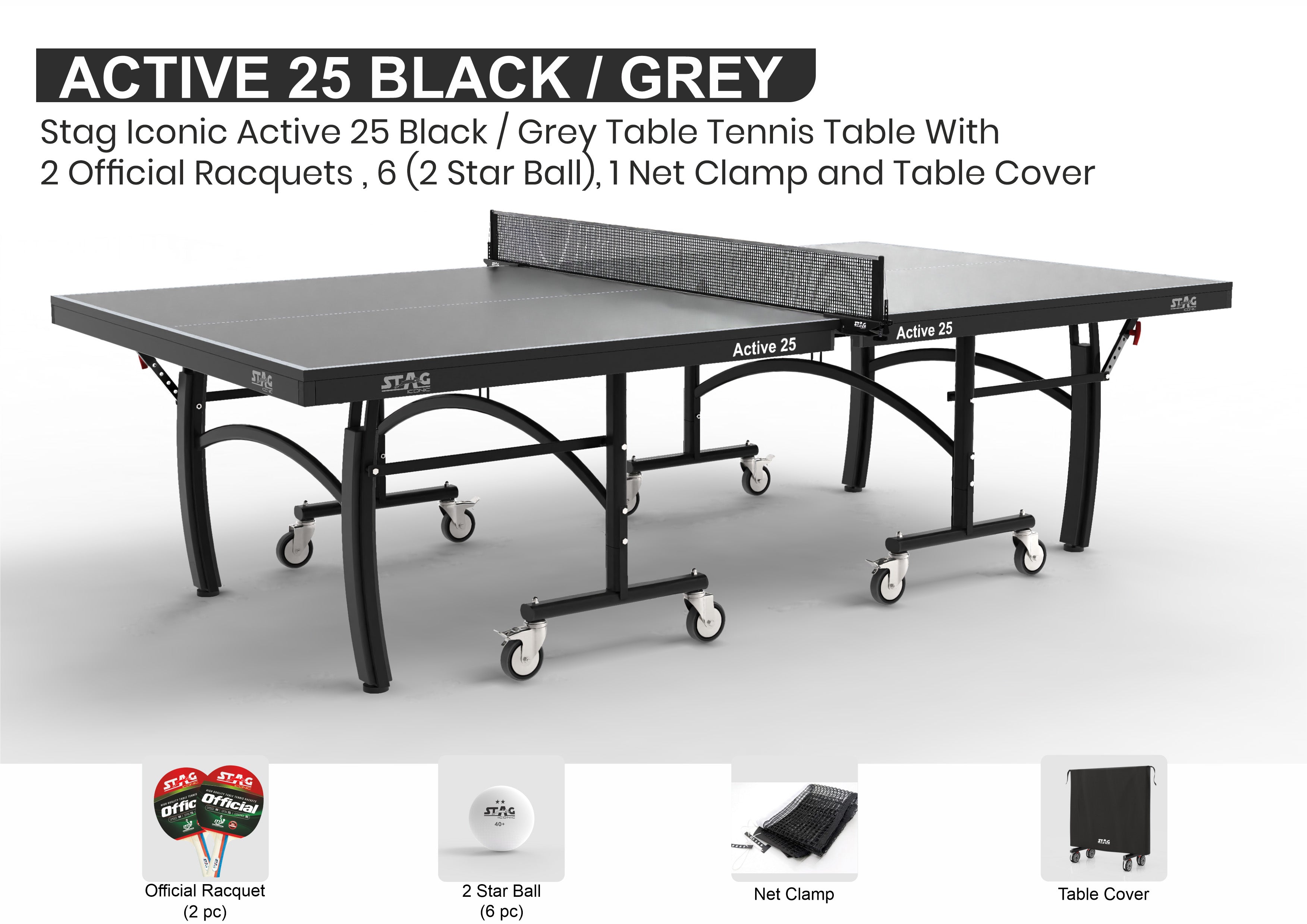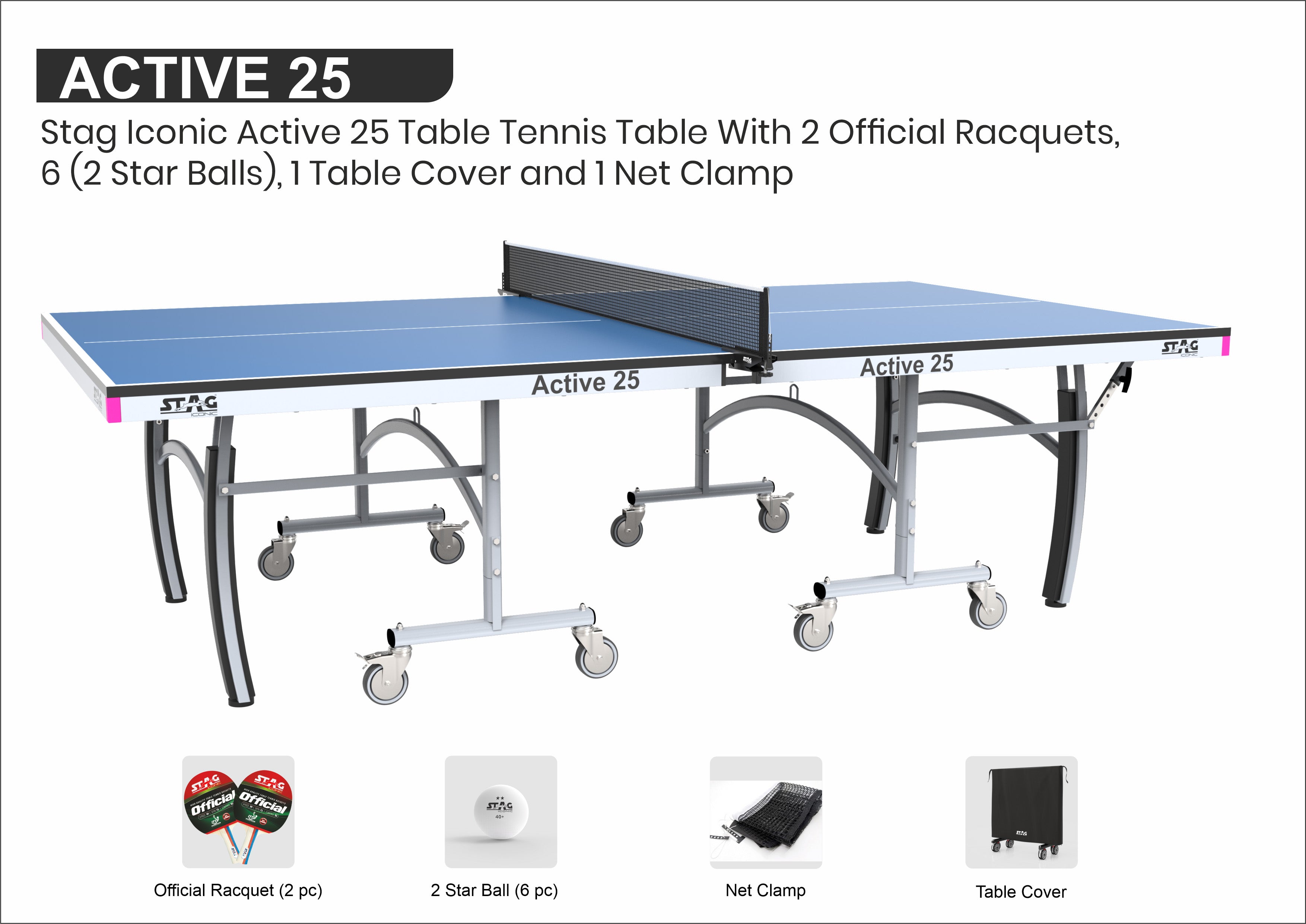 - Packaging Includes: 1 Stag Iconic Active 25 Table Tennis Table with 1 Clamp Net Set, 1 Table Cover, 2 Rackets, and 3 Balls.