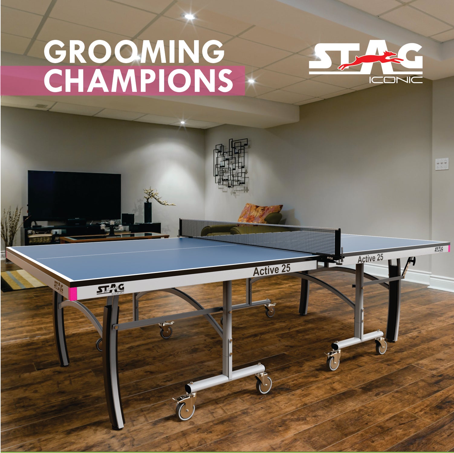 - Packaging Includes: 1 Stag Iconic Active 25 Table Tennis Blue Table with 1 Clamp Net Set, 1 Table Cover, 2 Rackets and 3 Balls.