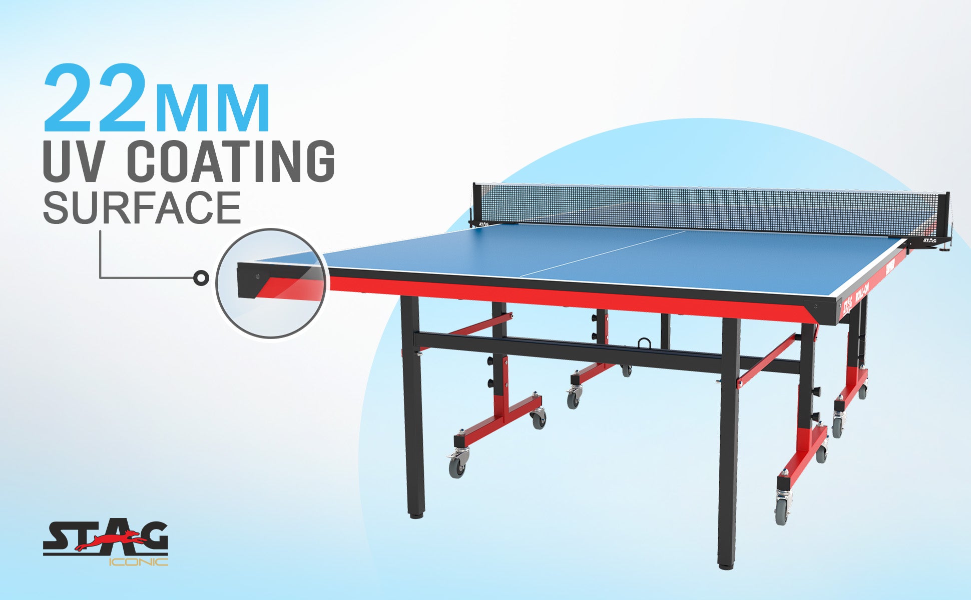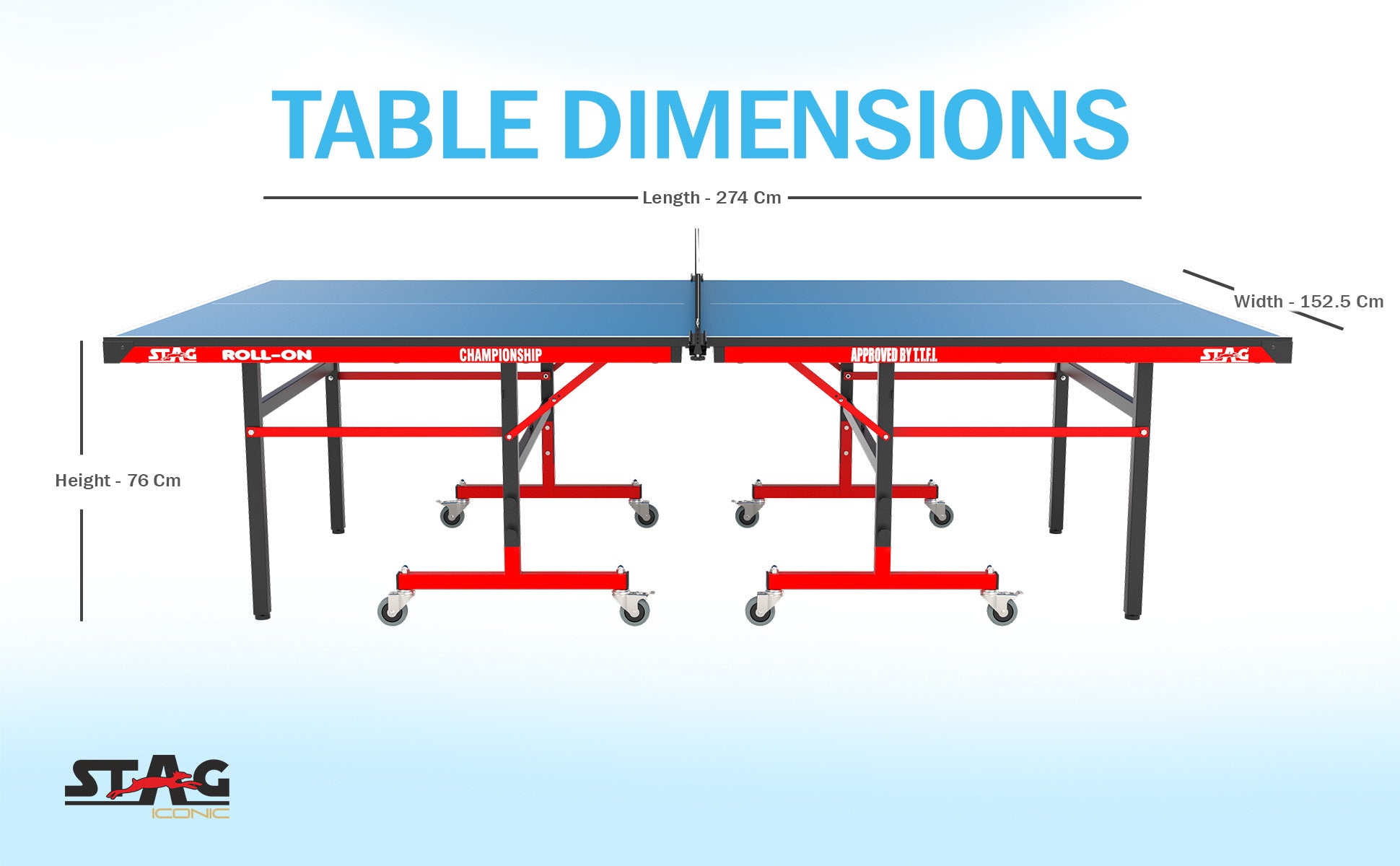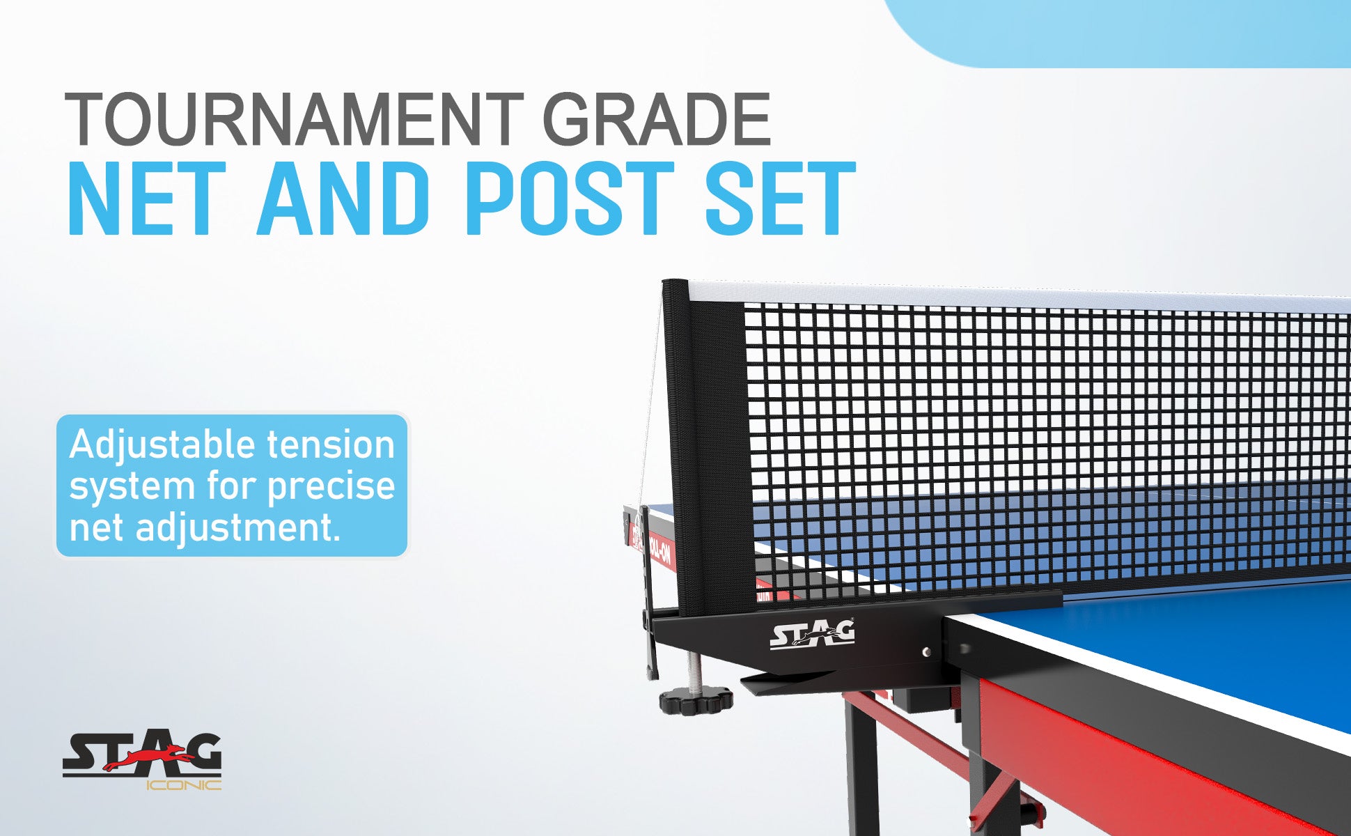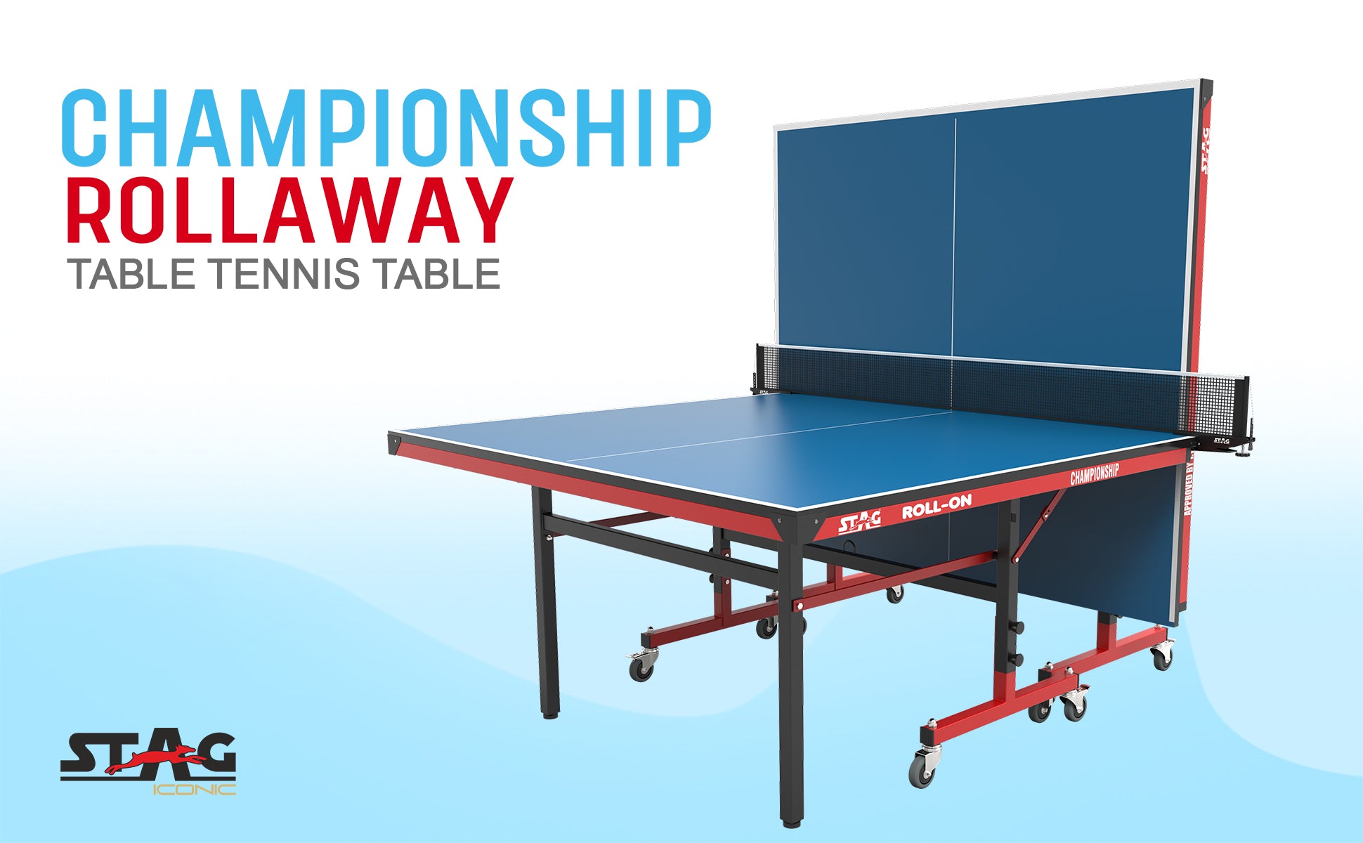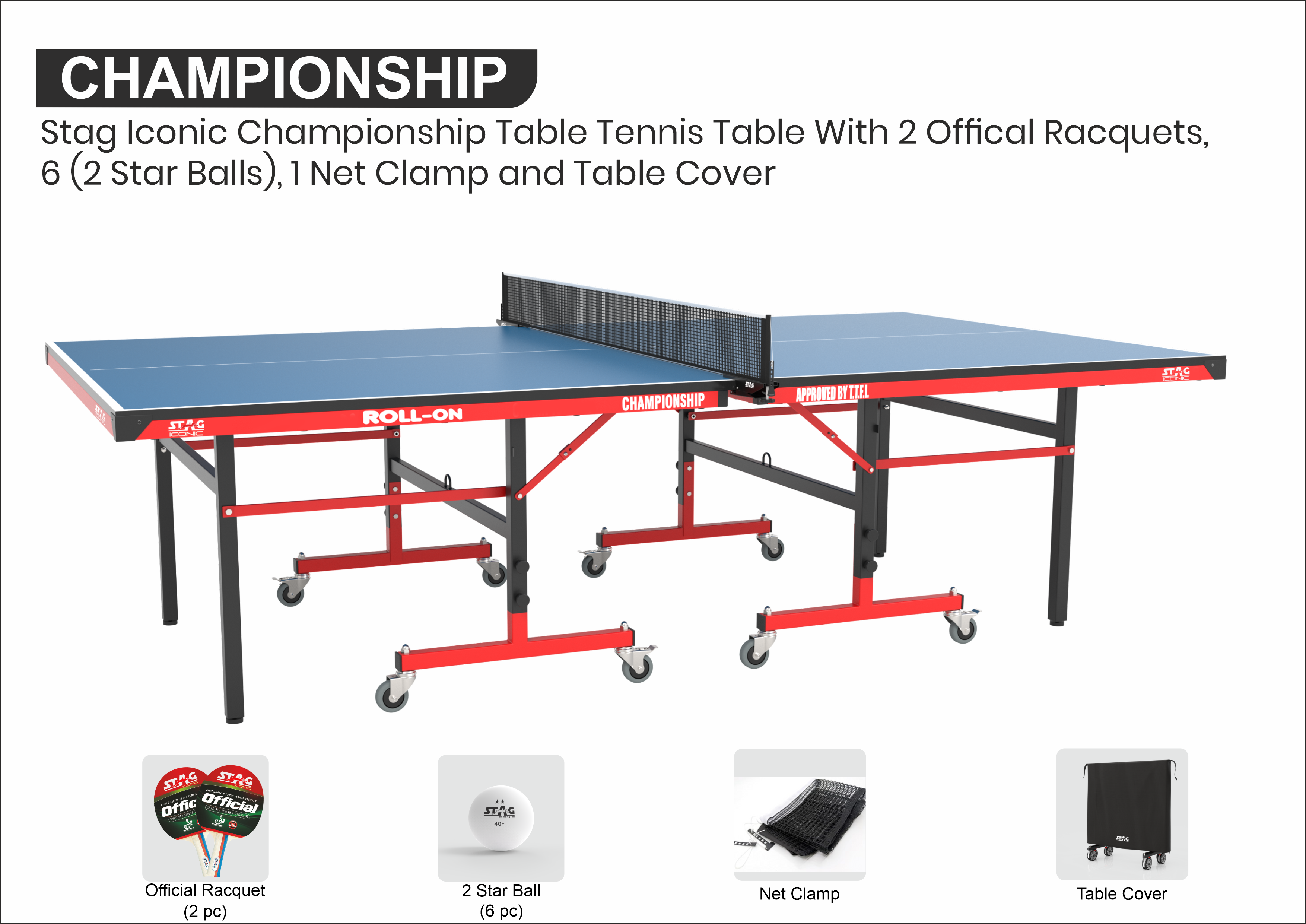 - Packaging Includes: 1 Stag Iconic Championship Rollaway Table Tennis Table with 1 Clamp Net Set, 1 Table Cover, 2 Rackets, and 6 Stag Iconic 2-Star Balls.