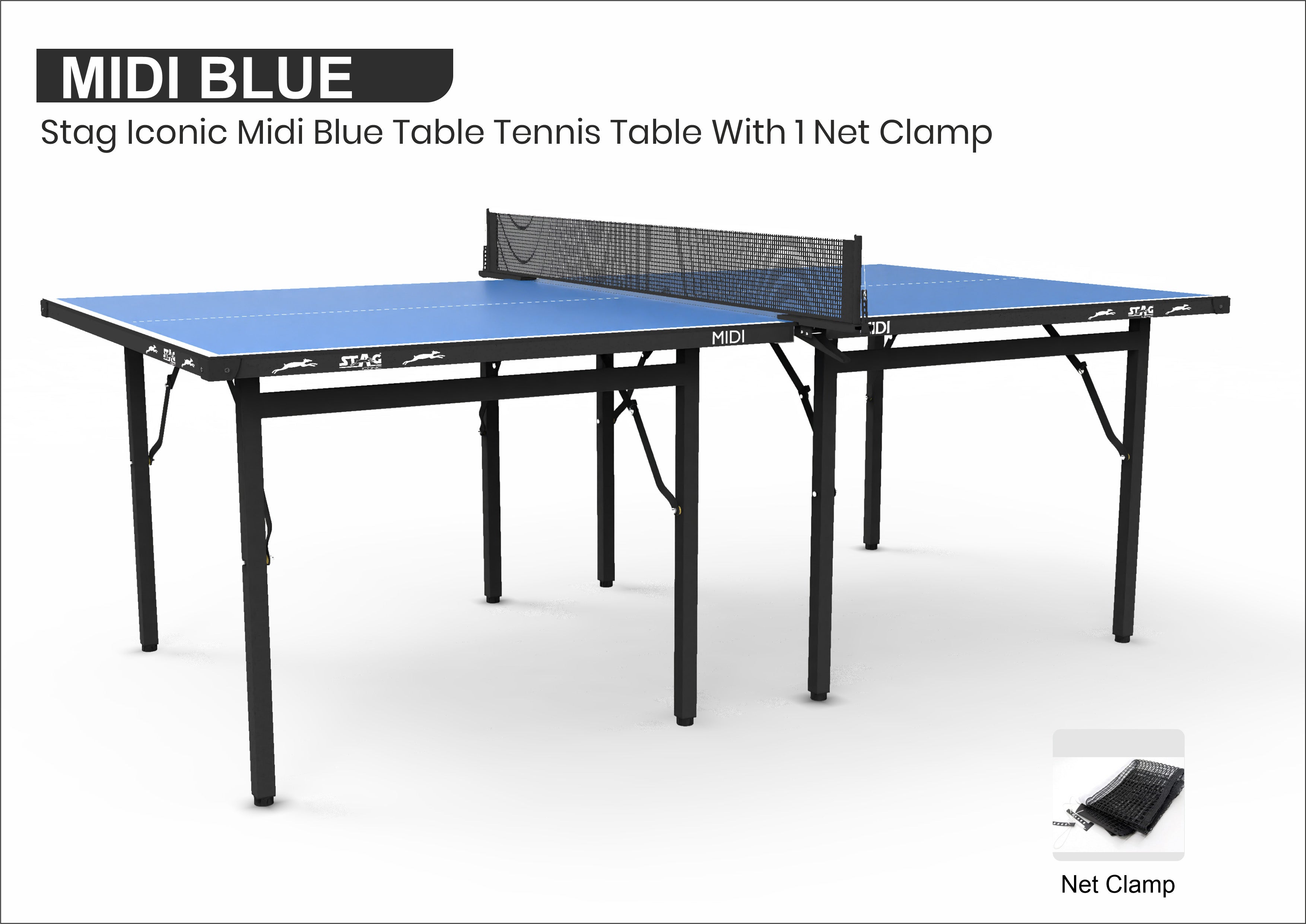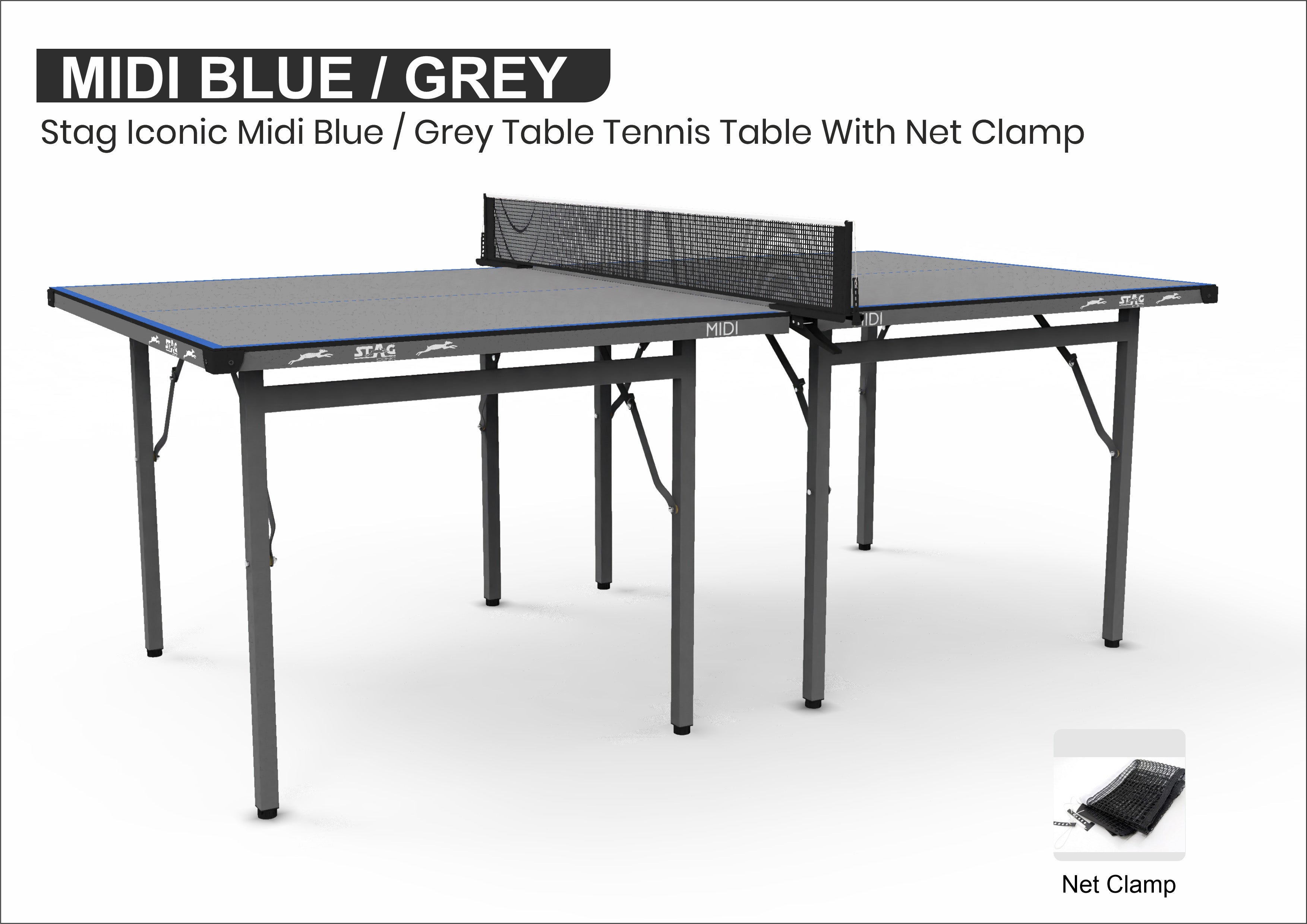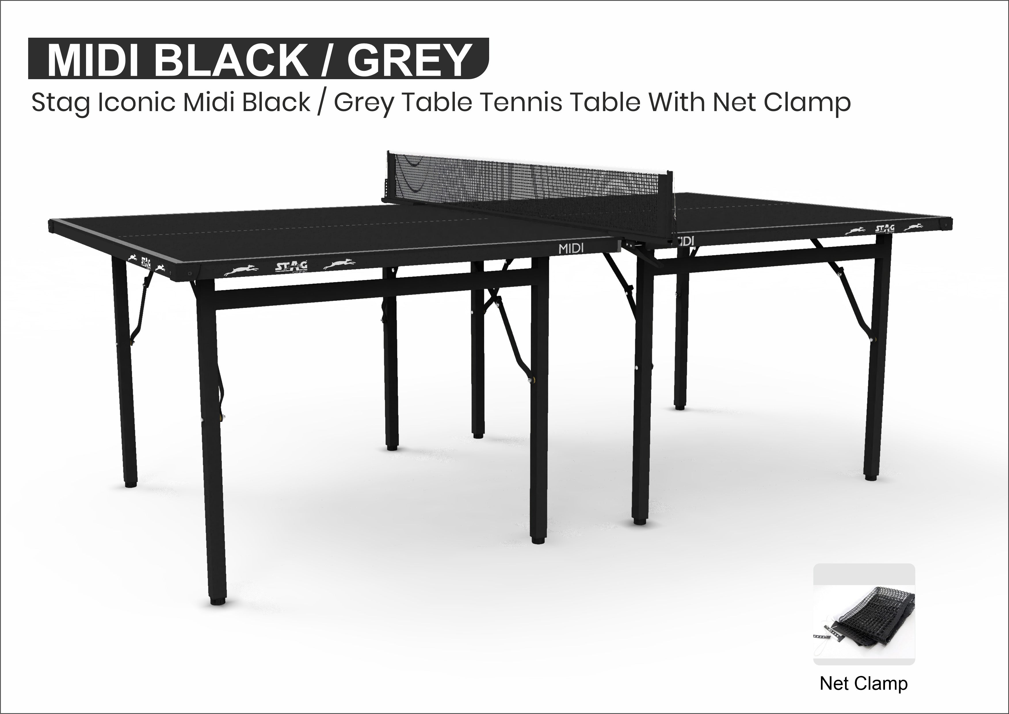 - Packaging Includes: 1 Stag Iconic Midi Black/Grey Table Tennis Table, 1 Clamp Net Set.
