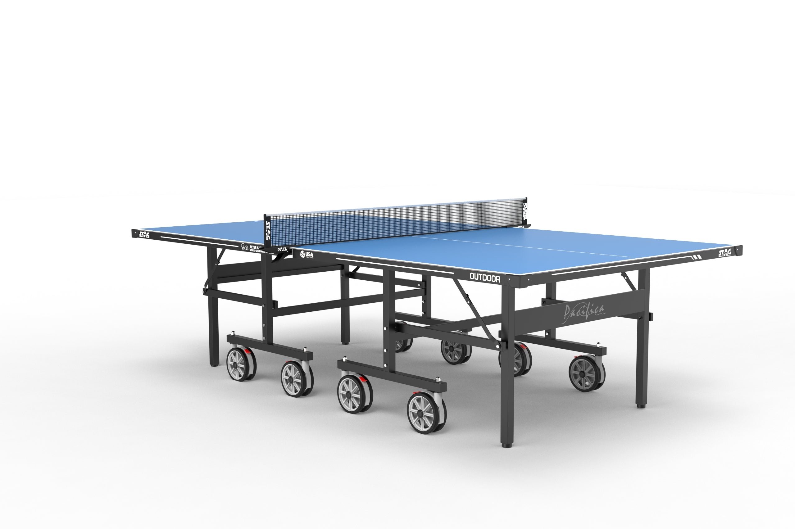 Designed for enthusiasts and professionals who love to play under the open sky, the STAG Iconic Weatherproof Pacifica Professional Table Tennis Table features a durable all-metal construction and a weatherproof PRO-TEC4 proprietary anti-glare and anti-skid playing surface. Enjoy perfect ball bounce and consistency in every game, no matter the weather.